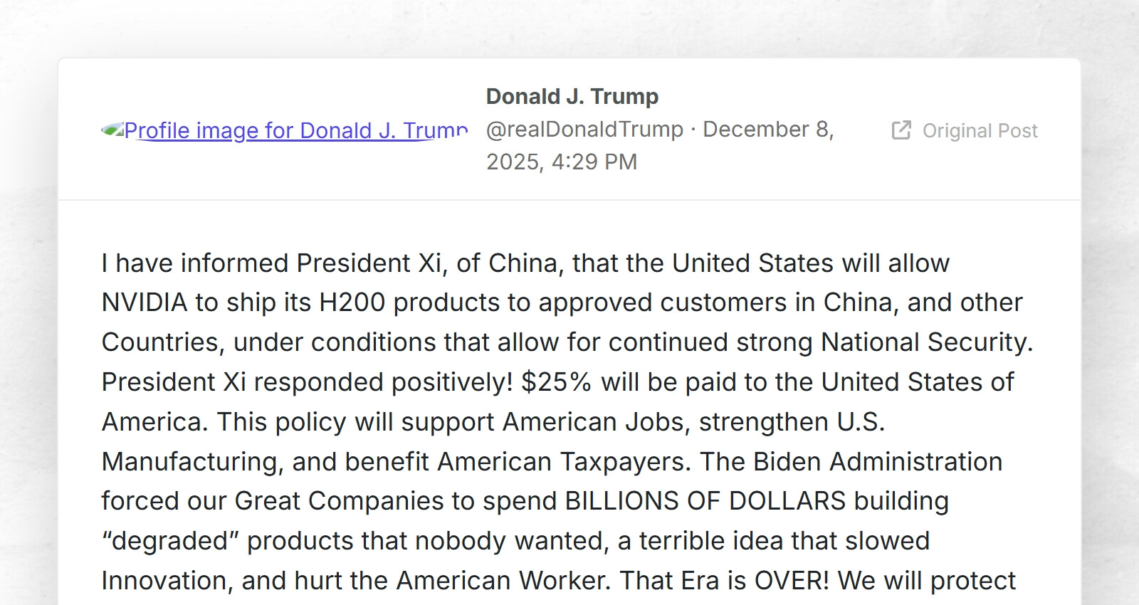 arrow-up113arrow-down1external-linkTrump greenlights Nvidia H200 AI chip sales to China if U.S. gets 25% cut, says Xi responded positivelyplus-squaretrumpstruth.orgKing@sh.itjust.works to Technology@lemmy.zipEnglish · 21 hours agomessage-square2linkfedilink
